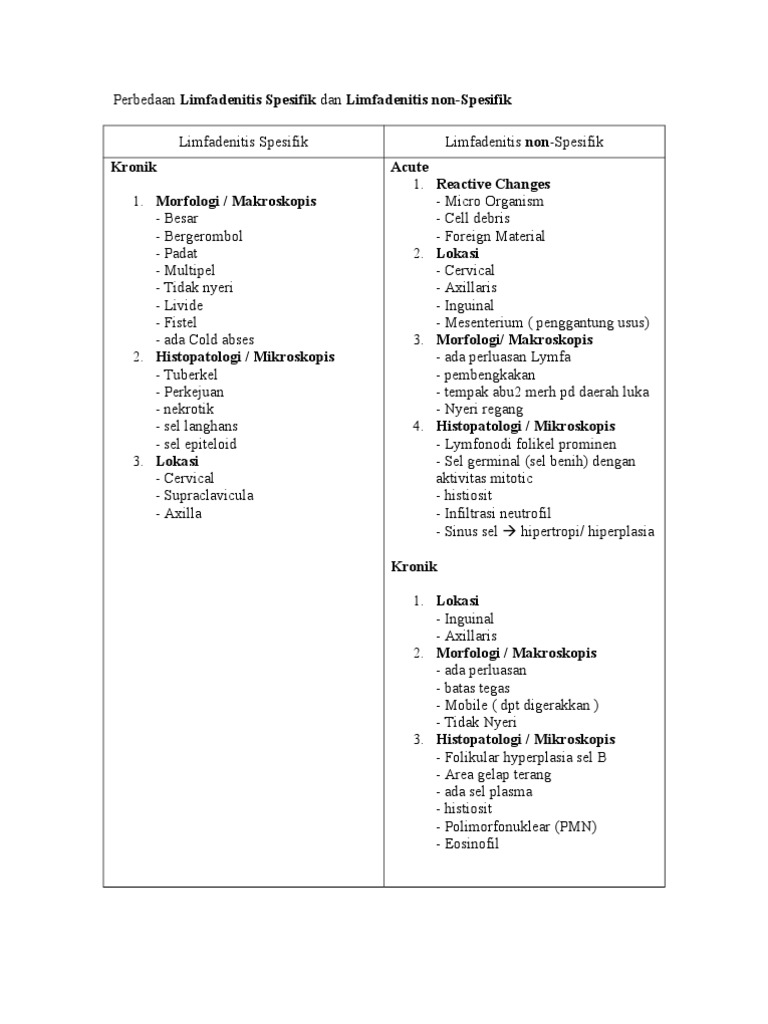 Dokter akan meraba kelenjar getah bening di kepala, leher, ketiak, dan lipatan paha. Ana patogen bakterial sing agresif, sing diarani limfadenitis kronis sing spesifik, nanging umume ora diijini kronis amarga kedadeyan kasebut ora bisa diobati. Bagian tengah dari limfonudulus yang berarna lebih terang dan berisi kumpulan limfosit. Spesifik olmayan mikroplara, neden sadece bakteriyel enfeksiyon nedeniyle değil, aynı zamanda virüslerin, parazitlerin veya tanımlanması zor olan diğer mikropların neden. Primer limfoma malignum ( hodgkin dan non hodgkin ) penyakit ini merupakan.